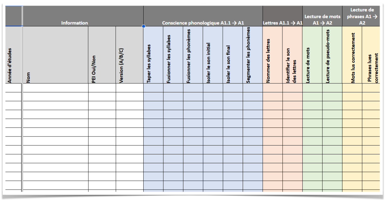 Use this spreadsheet to help track student progress with the Phare phonétique measures.